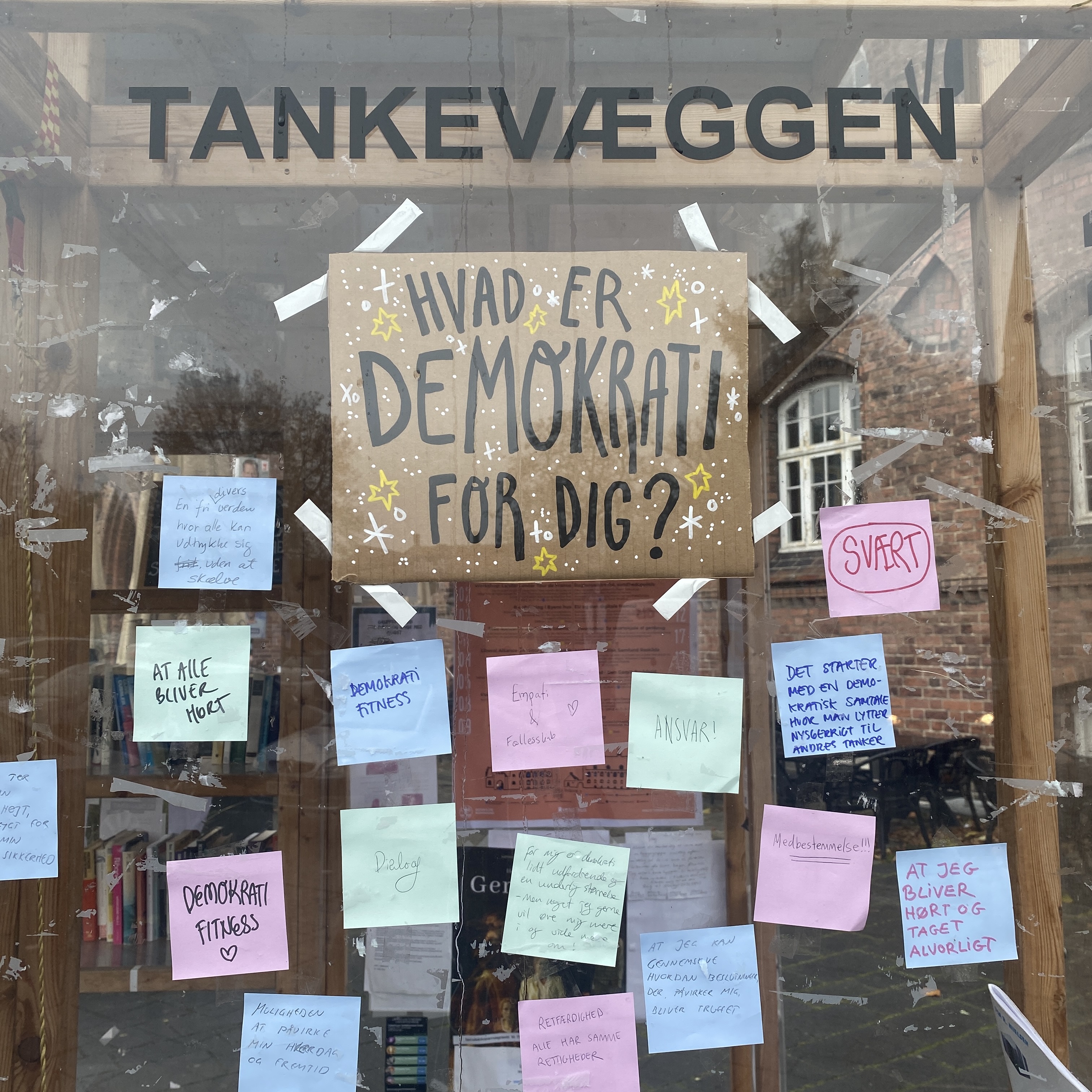 Med tankevæggen ønsker demokratihuset Byens hus Roskilde at invitere dig, og jer, til at stoppe op på det samme sted og blive klogere på andres perspektiv – uden at mødes eller gå i direkte dialog.