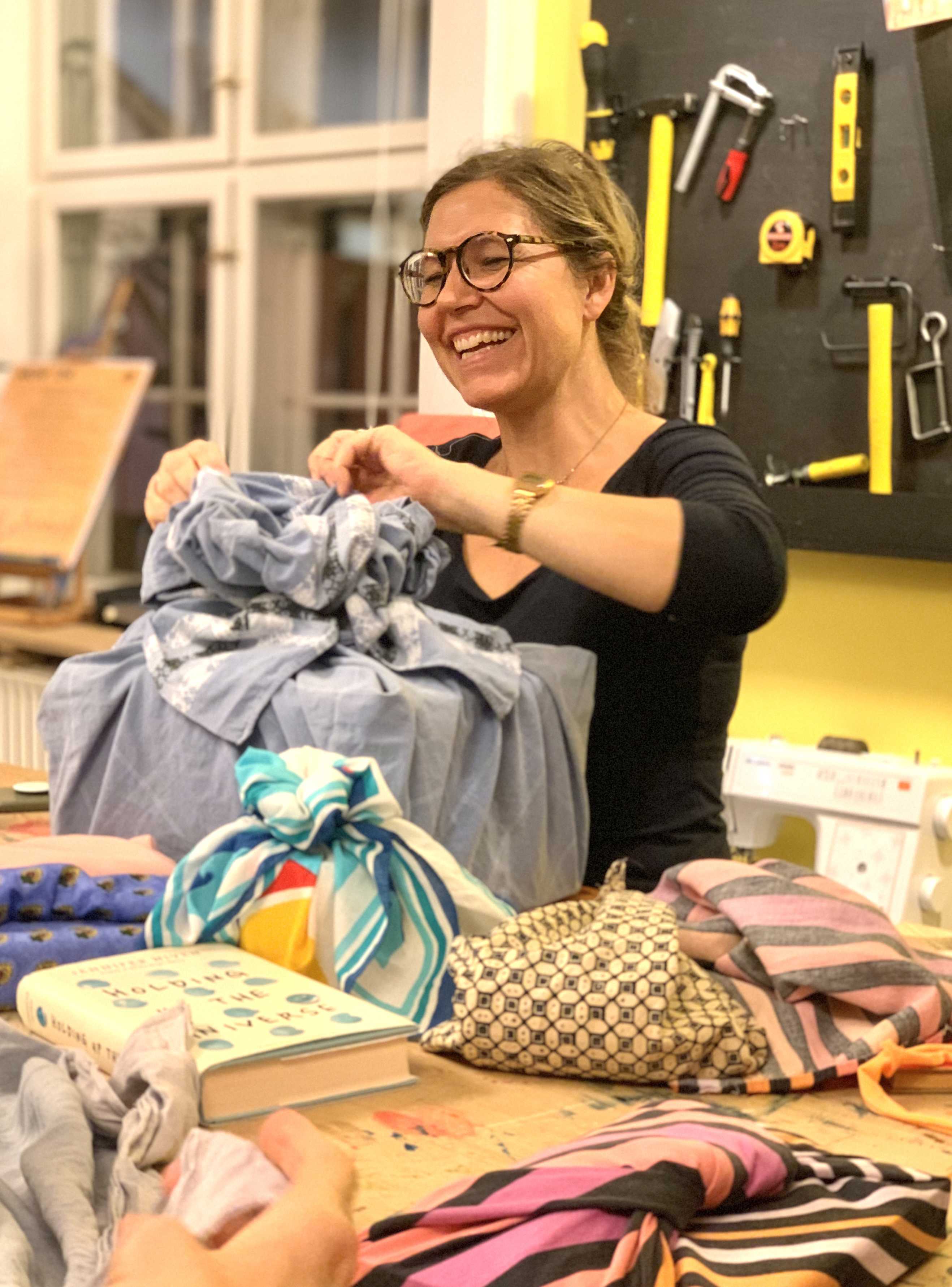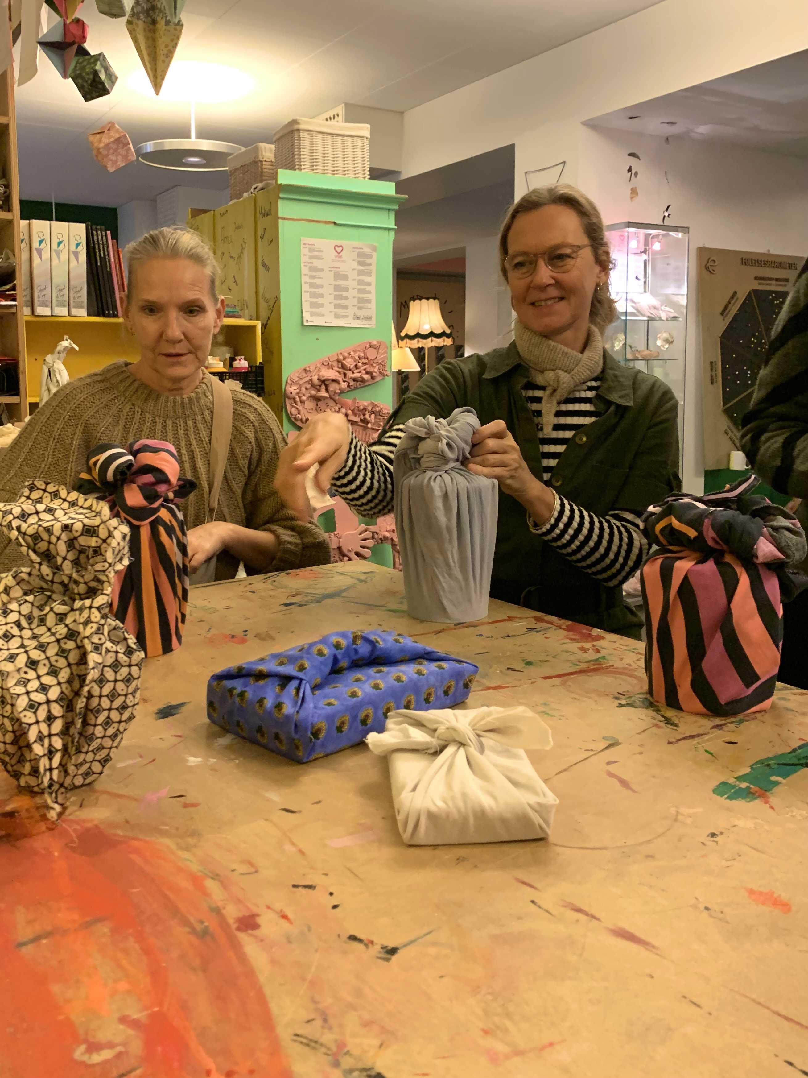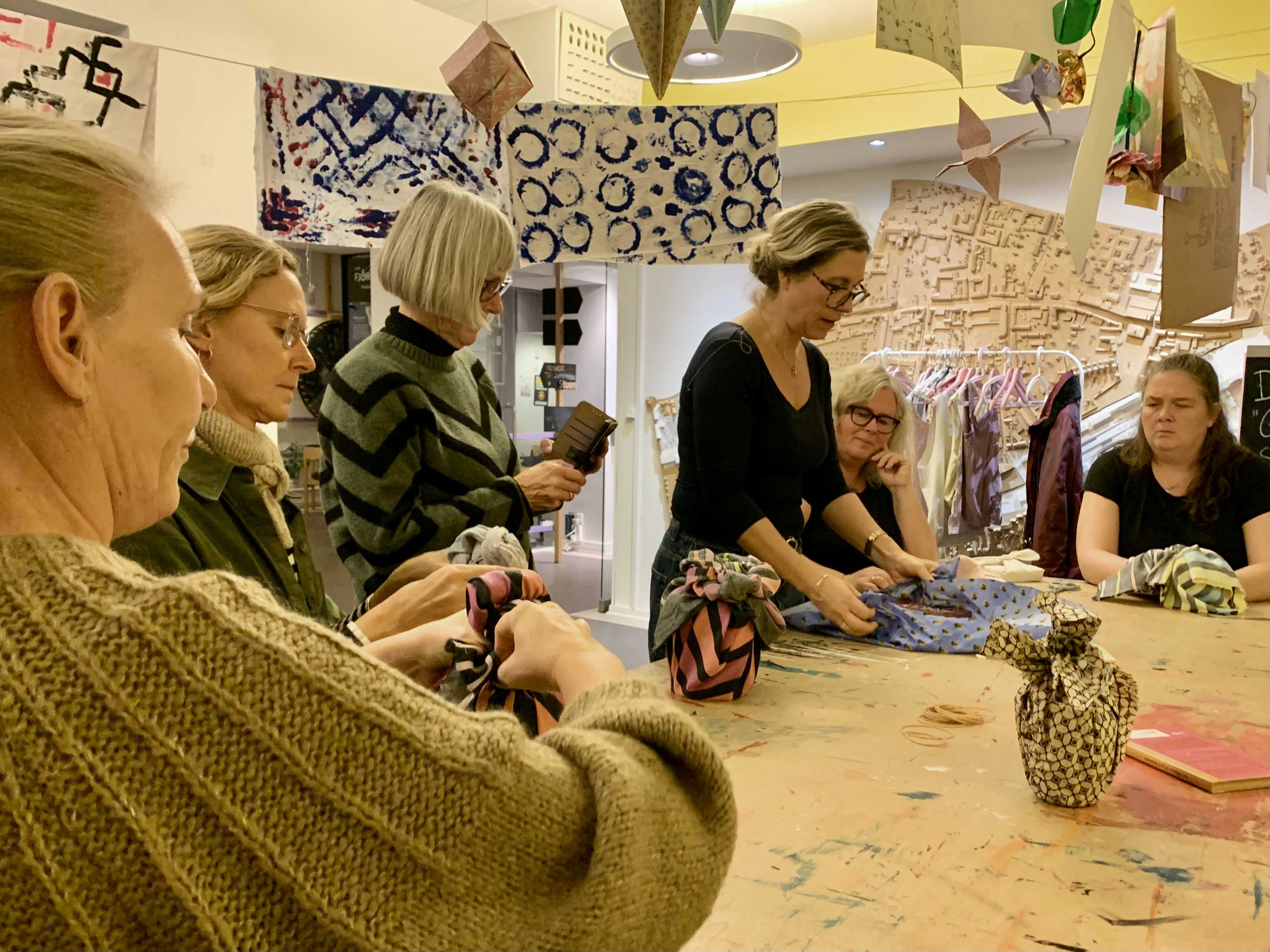Vi starter med at omdanne donerede stofrester til gave-stof og bagefter lærer du nogle simple teknikker, som kaldes ’Furoshiki’.