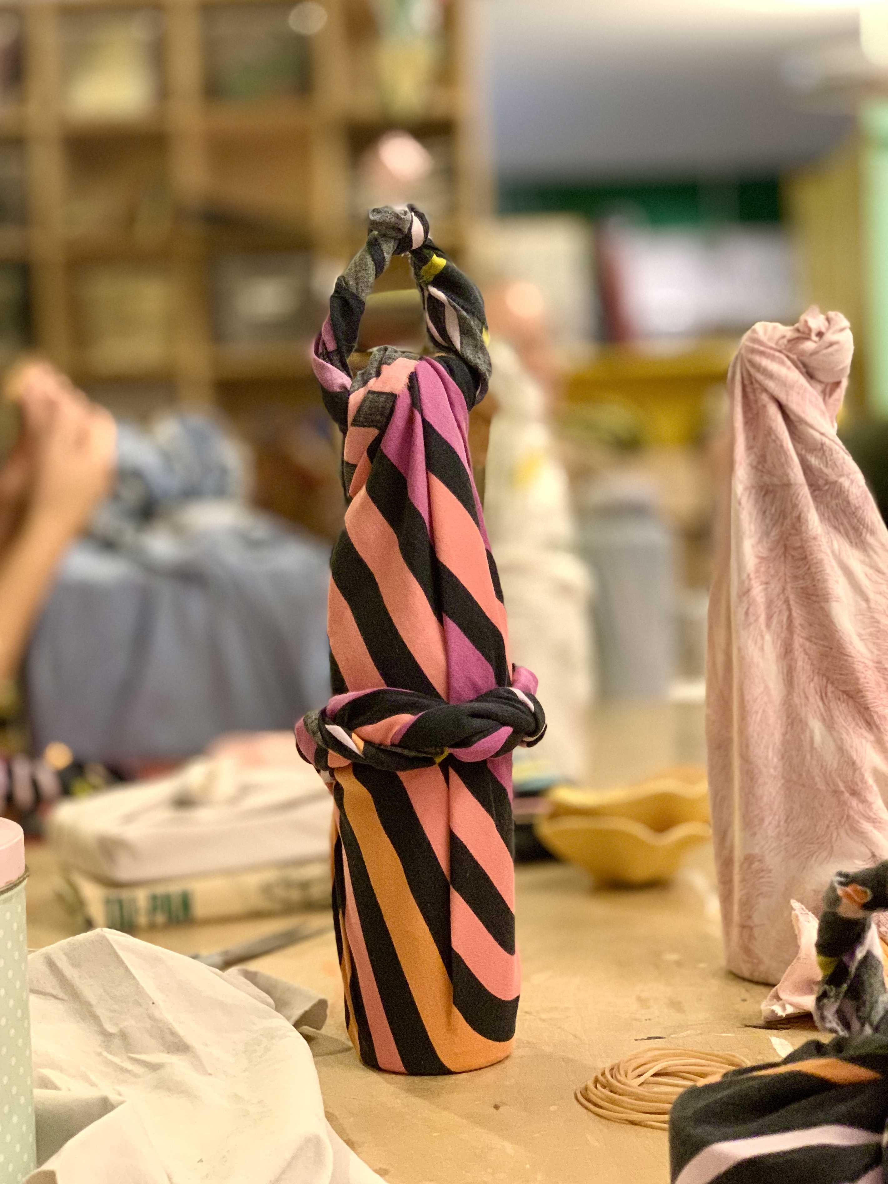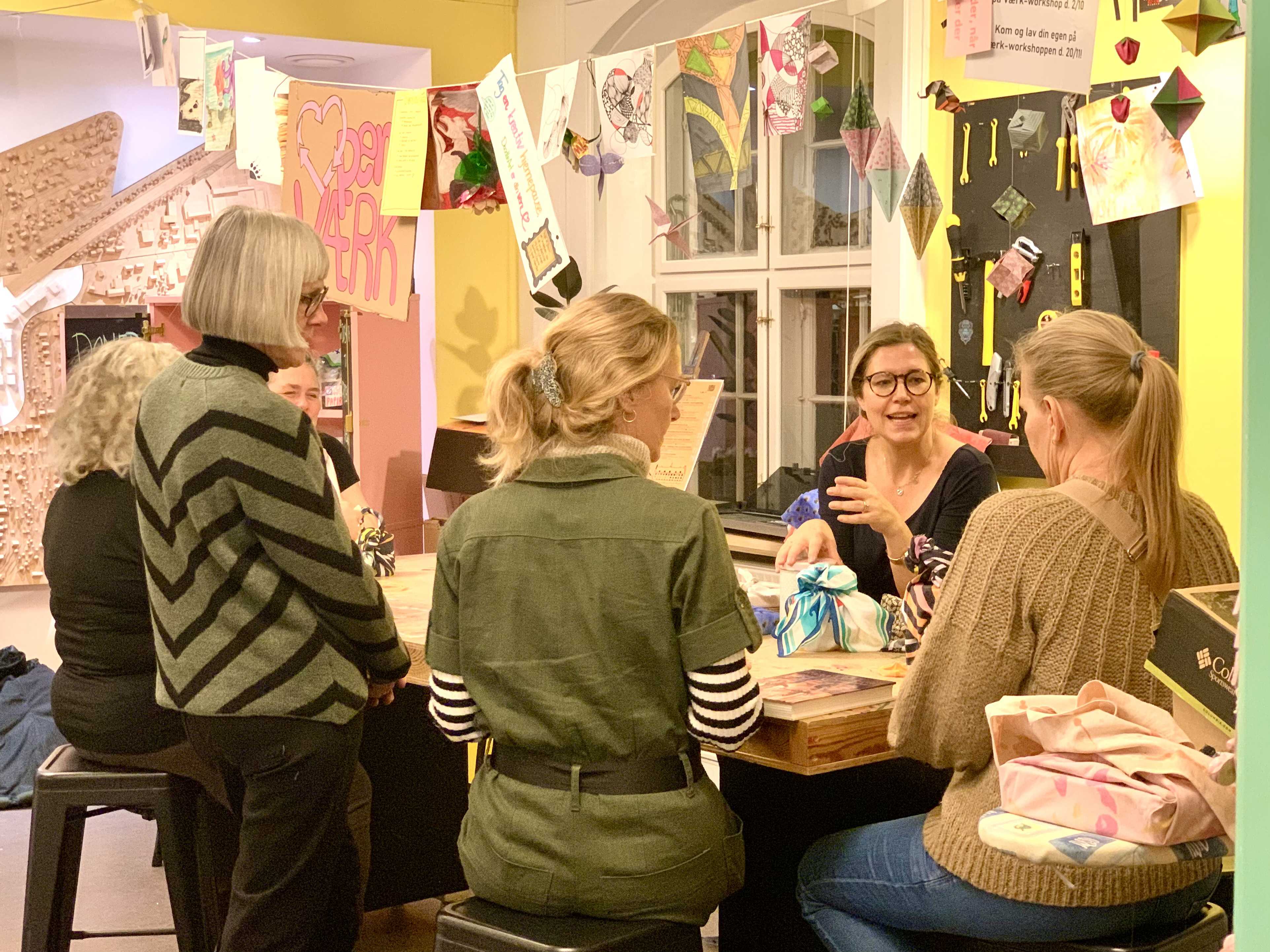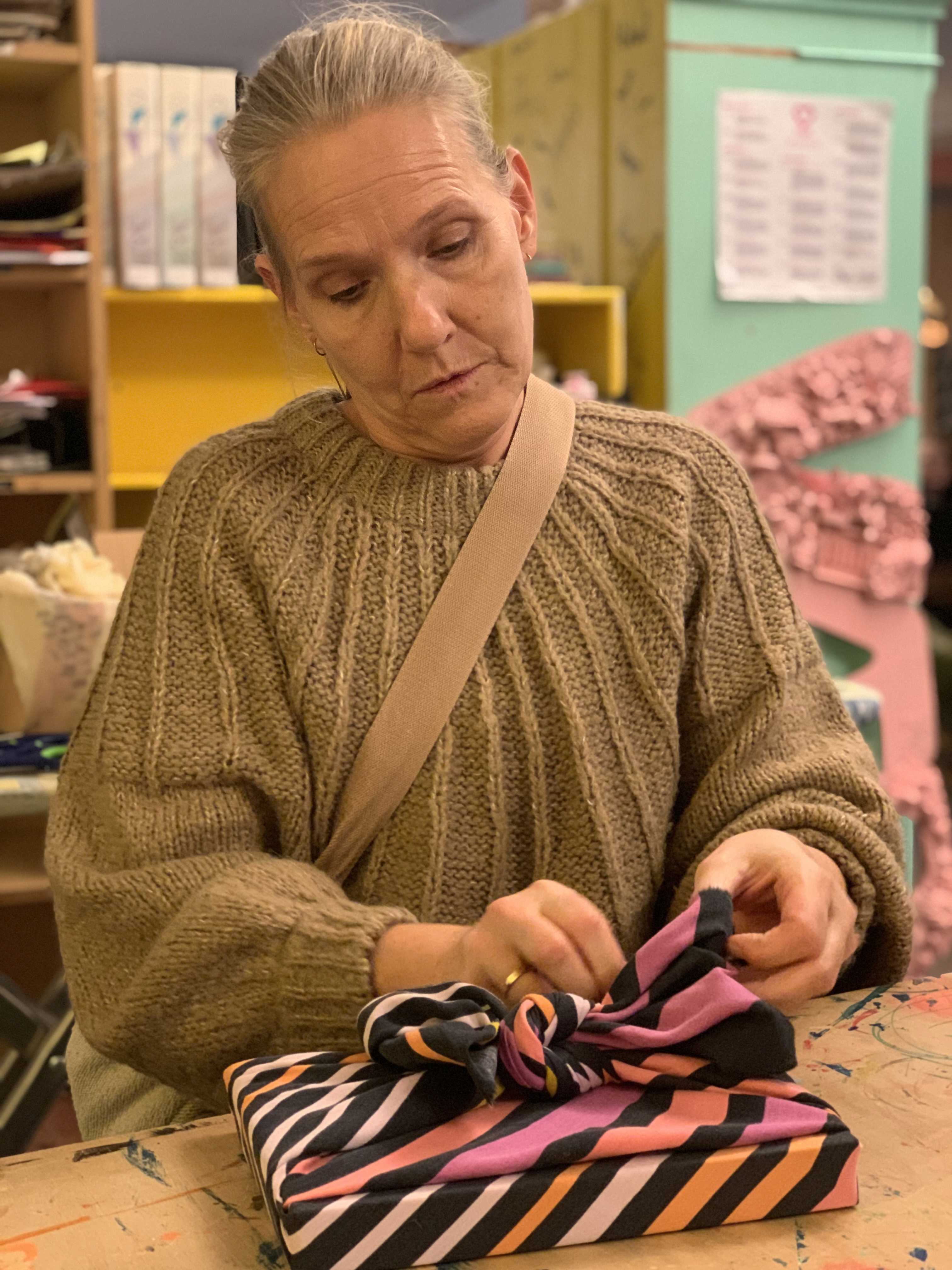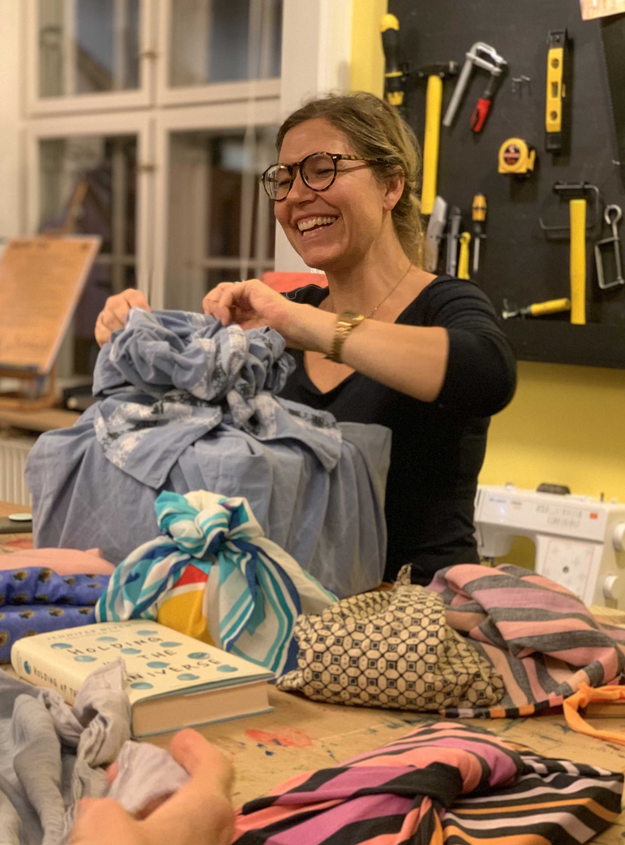 Vi starter med at omdanne donerede stofrester til gave-stof og bagefter lærer du nogle simple teknikker, som kaldes ’Furoshiki’.