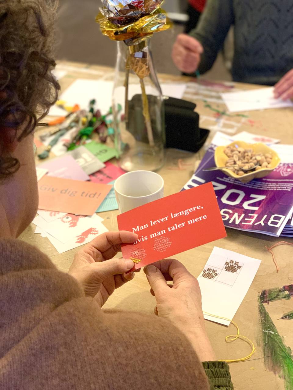 Vi laver små broderier på postkort, så de får et andet udtryk. Tilføj en blomst, et bogstav, en emoji… eller sæt farve på dele af motivet.