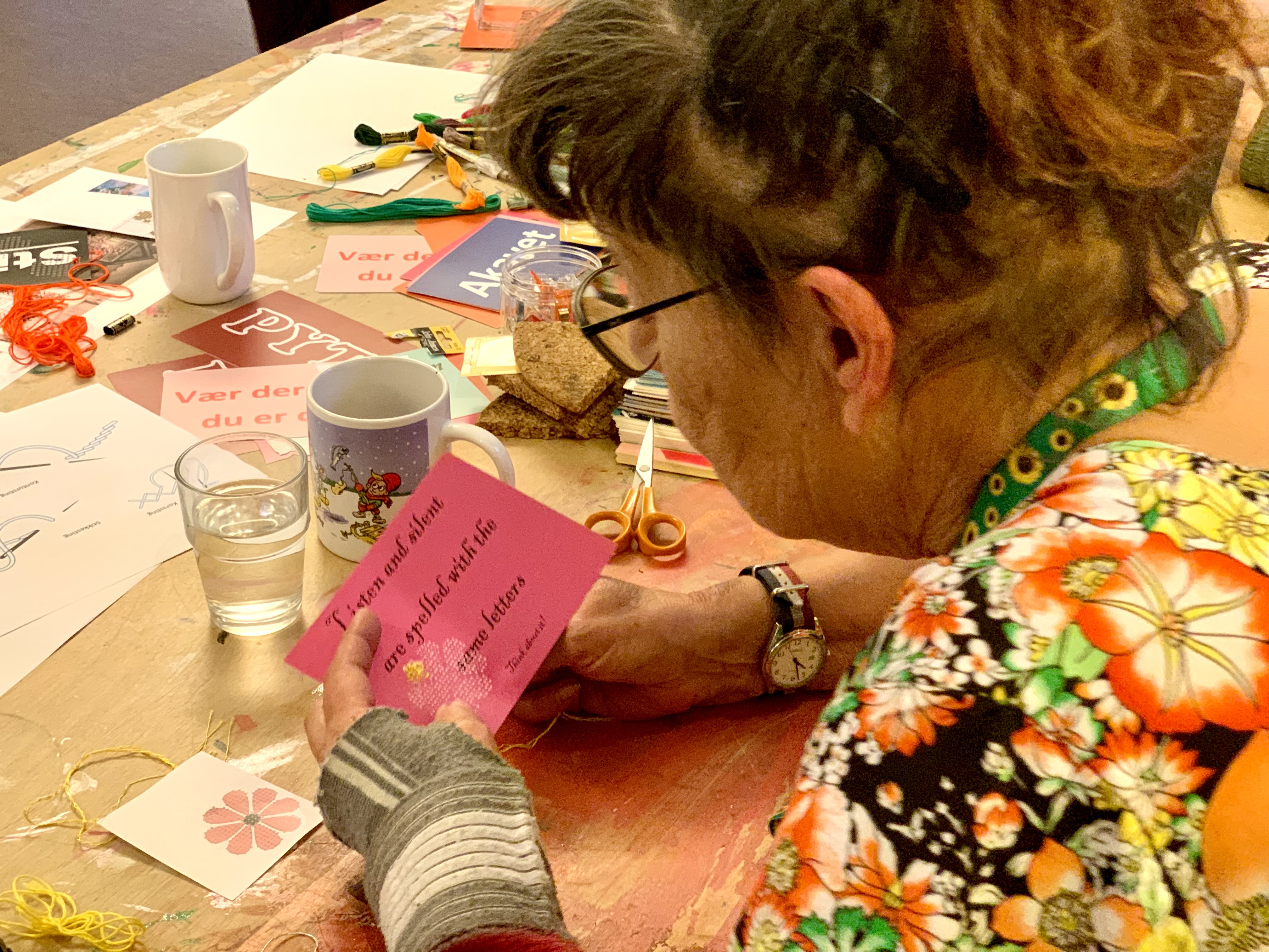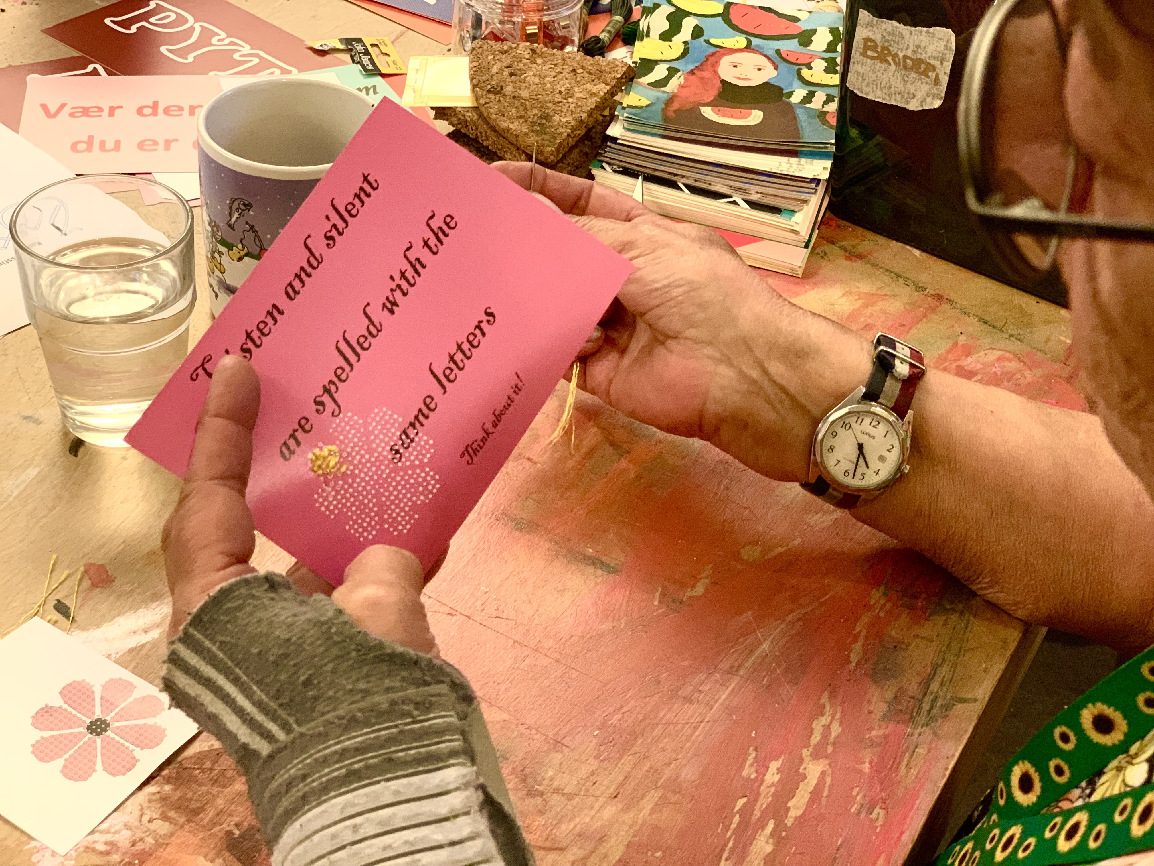 Vi laver små broderier på postkort, så de får et andet udtryk. Tilføj en blomst, et bogstav, en emoji… eller sæt farve på dele af motivet.