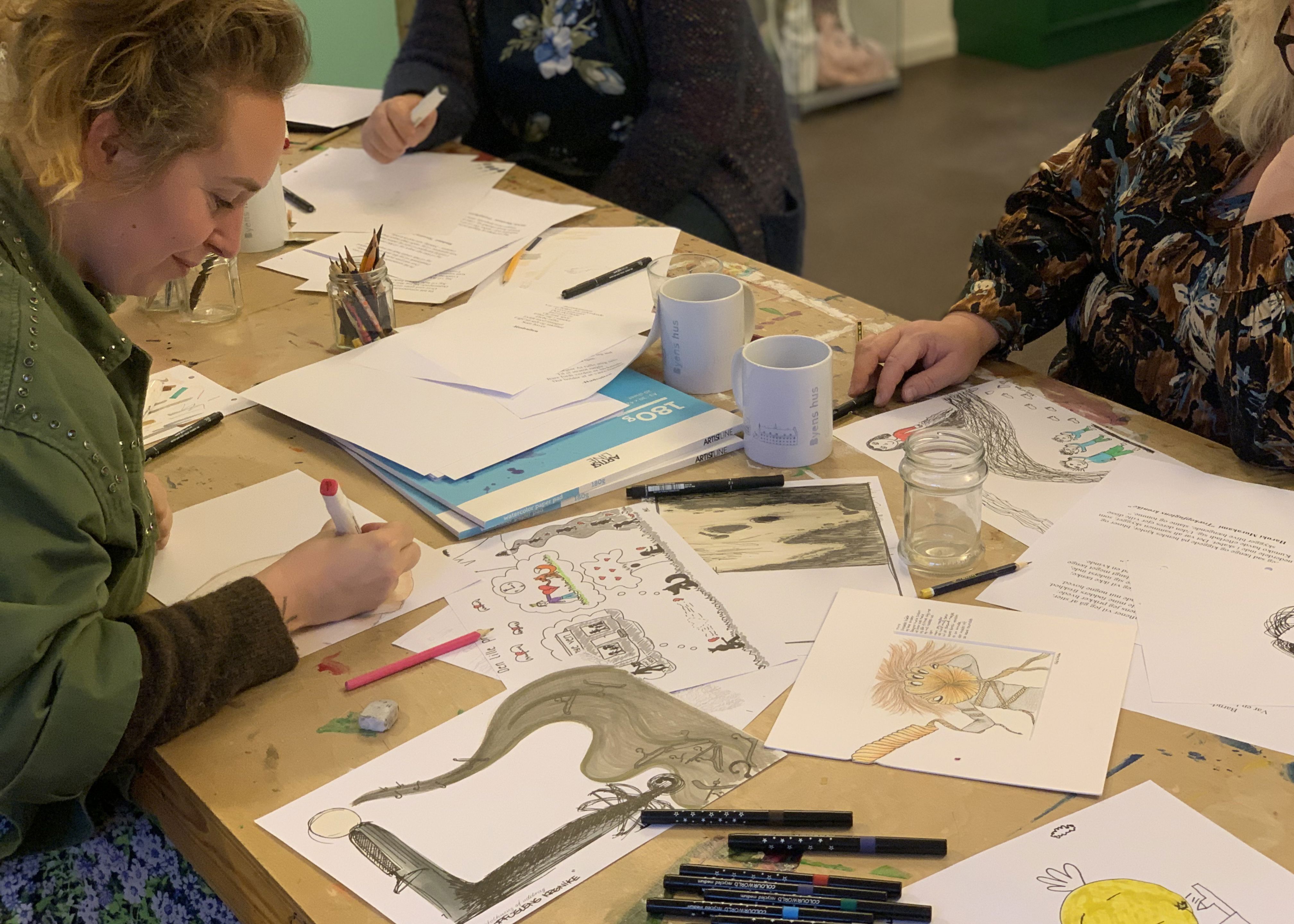 Tekst og tegning bygger på en kobling mellem litteratur og billedkunst. At finde skjulte skatte i tekster og formidle dem gennem billedkunst. Poesi eller små tekster/historier – måske indsamlet af skjulte skribenter rundt i Roskilde. En indsamlet skattekiste af følelser, fantasi og fortælling fra borger i Roskilde.