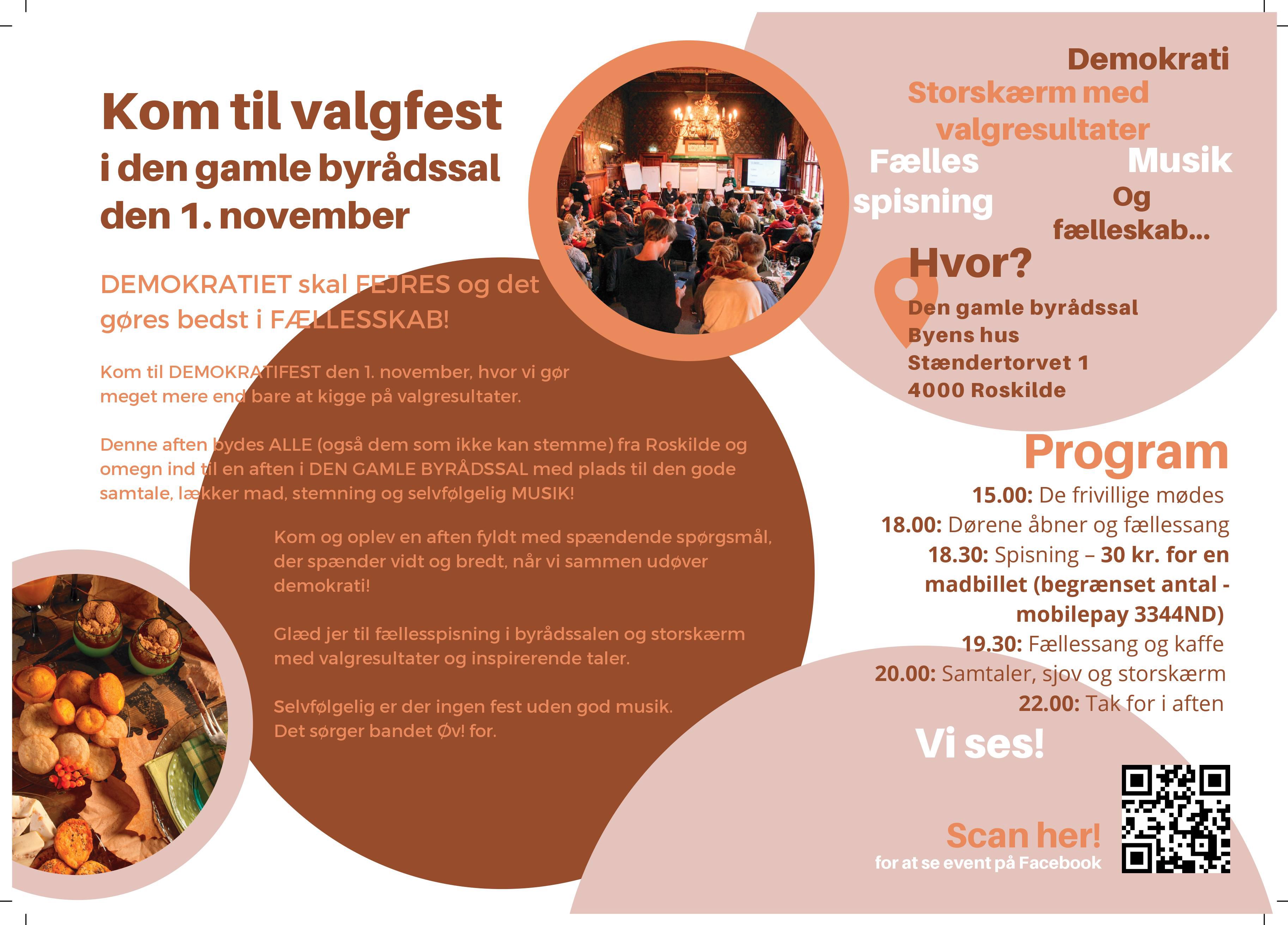 Programmet er stadigvæk i støbeskeen, men glæd jer til fællesspisning i byrådssalen og storskærm med valgresultater og inspirerende taler.